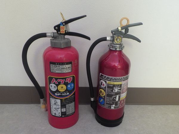 どちらも粉末(ABC)消火器で、左側がガス加圧式で右側が蓄圧式です。