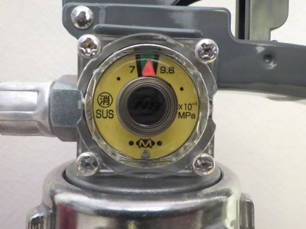 この様に指示圧力計があるので内部圧力の確認ができ、この消火器の場合は赤色の指針が緑色のゾーンの、0.70~0.98MPa(メガパスカル)の範囲内の圧力なのでこの消火器は正常です。